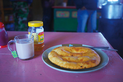 チベタンブレッドトレッキングでの朝食時によく好んで食べたチベタンブレッド。平べったい生地に切れ目を入れて油で揚げたもの。表面はカリカリ、中はもちっとした弾力がある。甘くて濃厚なネパールの蜂蜜がとてもよく合う。